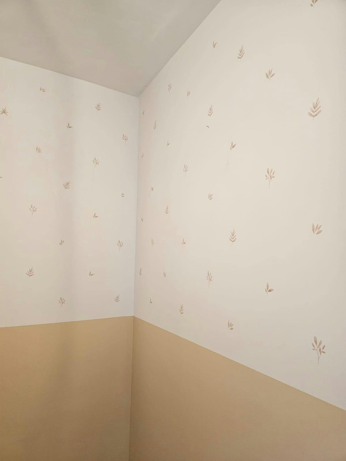 Al final encontramos Nicolasito, pedimos muestras de hojas marrones y beige y finalmente nos quedamos con las beige. Hicimos un pedido de 4 paquetes para obtener un efecto de papel pintado y el resultado final nos gustó mucho.