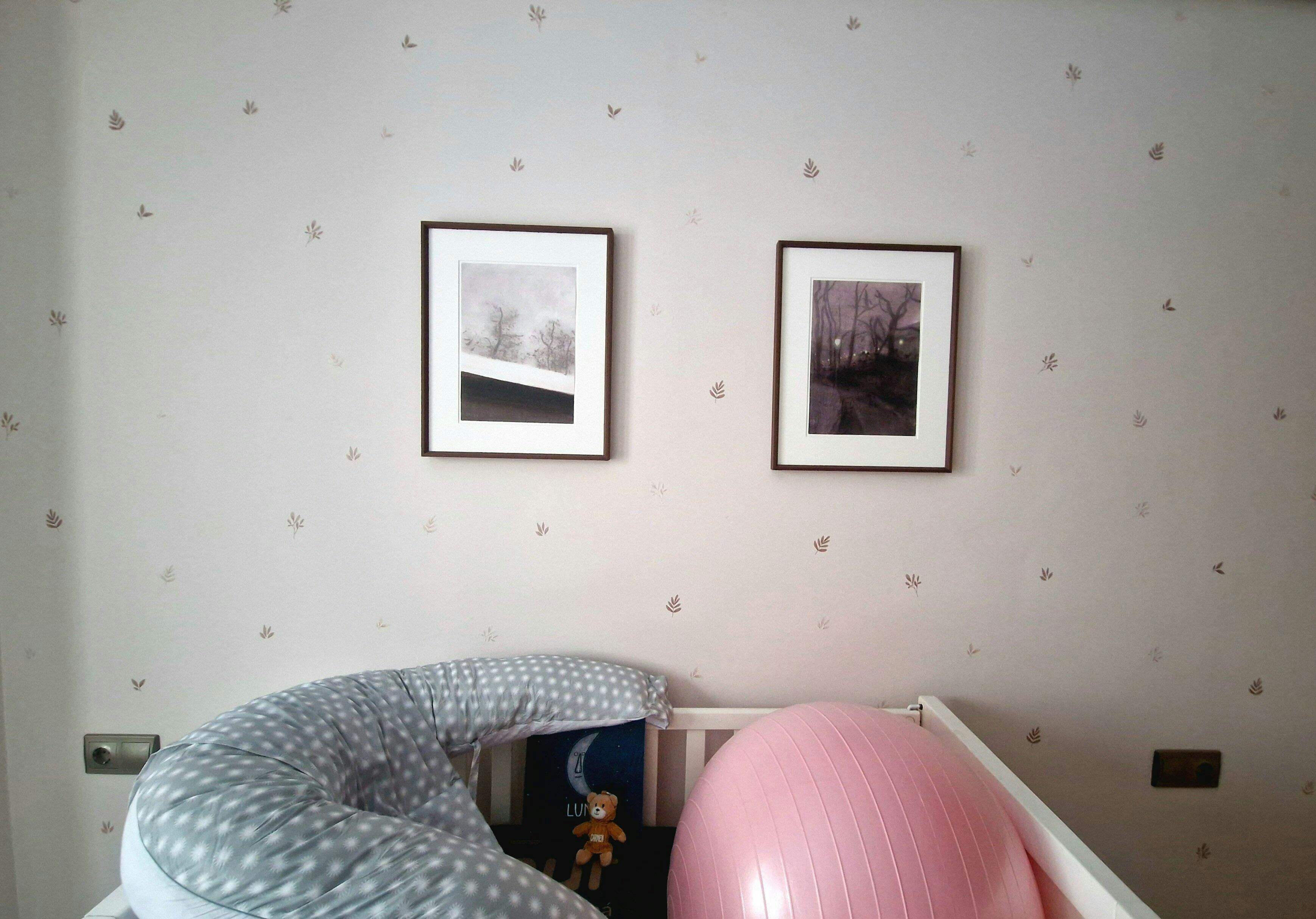 Queríamos un cuarto con paredes de una tonalidad delicada y neutra para nuestro bebé. Pintamos mitad de la pared de color Beige Macadamia y buscamos en varias tiendas un papel pintado para la parte de arriba. Desafortunadamente, no encontramos muchas opciones en las otras tiendas ya que los diseños de los papeles pintados eran bastante grandes y nosotros queríamos obtener un efecto más delicado (aunque es verdad que alguno parecido sí que lo encontramos).