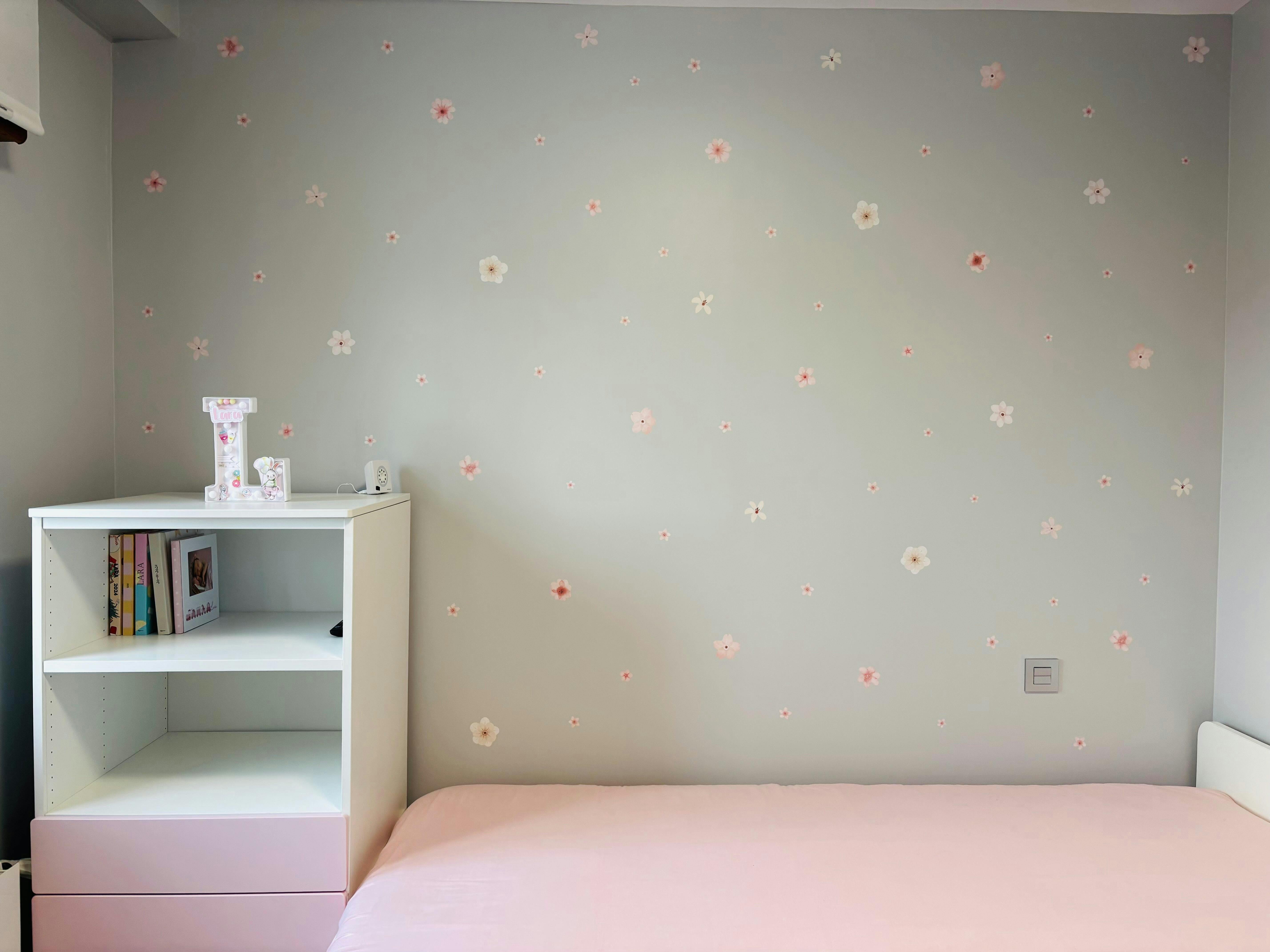 1) Aconsejo pasar un trapos seco en las paredes antes de pegar las hojas. Nosotros tuvimos que tirar varias porque ya no se pegaban. Se quedaban con el polvo de la pintura pegado y ya no se podían colocar en la pared.